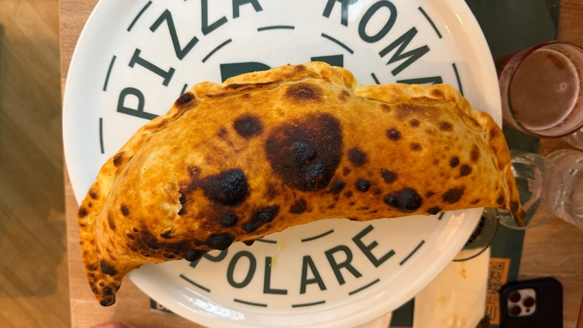 Il punto di partenza è lo stesso impasto della pizza, lavorato con biga e pensato per garantire leggerezza e struttura. Ma è la tecnica di cottura a fare davvero la differenza: il calzone viene prima fritto e poi passato in forno. Una doppia cottura studiata per ottenere una croccantezza esterna più marcata, capace di contenere il ripieno senza perdere fragranza né cedere all’umidità interna.