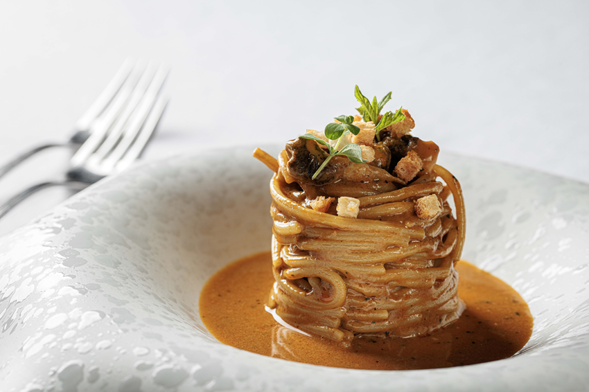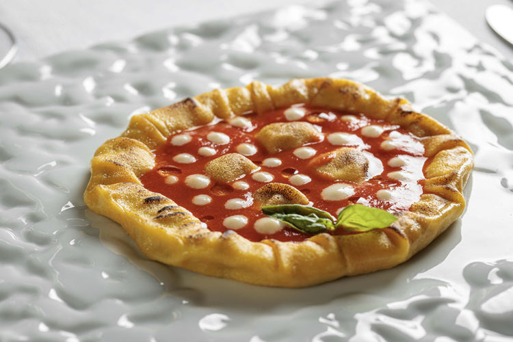Tra le proposte più rappresentative del menu spicca Omaggio a Napoli, una rivisitazione della pizza in chiave di pasta fresca: un grande raviolo che ne richiama l’aspetto e lo spirito, con ripieni di pesce e piccoli dettagli che evocano le tipiche “bolle” della pizza napoletana.